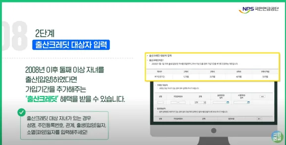 2008년 이후 둘째 이상 자녀를 출산(입양) 하였다면 가입기간을 추가해 주는 출산크레디트 혜택을 받을 수 있습니다.
